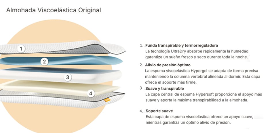La viscoelástica ofrece una adaptabilidad progresiva y sensación de relax, permitiendo que la cabeza descanse comodamente durante las horas de sueño. Combina 3 capas de diferentes grosores y firmezas: Viscoelástica Hypergel, espumación Hypersoft y Viscoelástica.