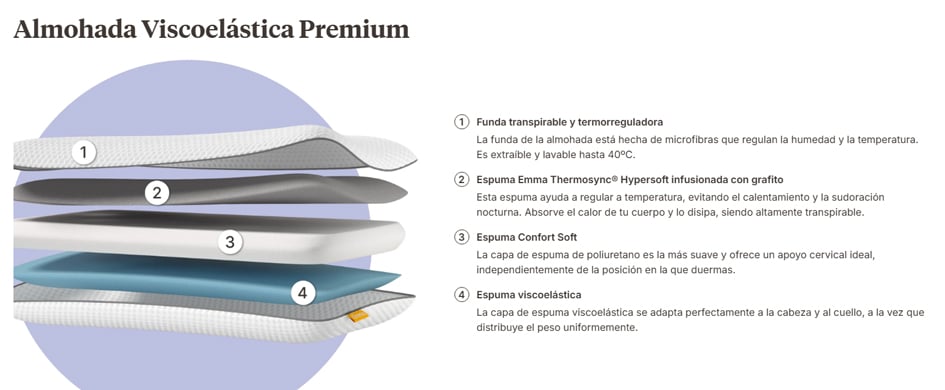La viscoelástica ofrece una adaptabilidad progresiva y sensación de relax, permitiendo que la cabeza descanse comodamente durante las horas de sueño. Combina 3 capas de diferentes grosores y firmezas: espuma Thermosync Hypersoft, espumación Confortrsoft y Viscoelástica.