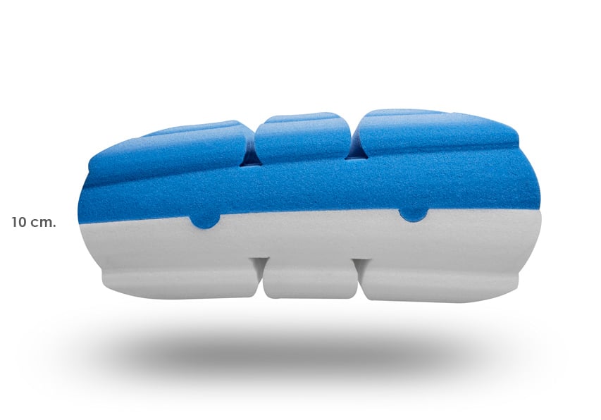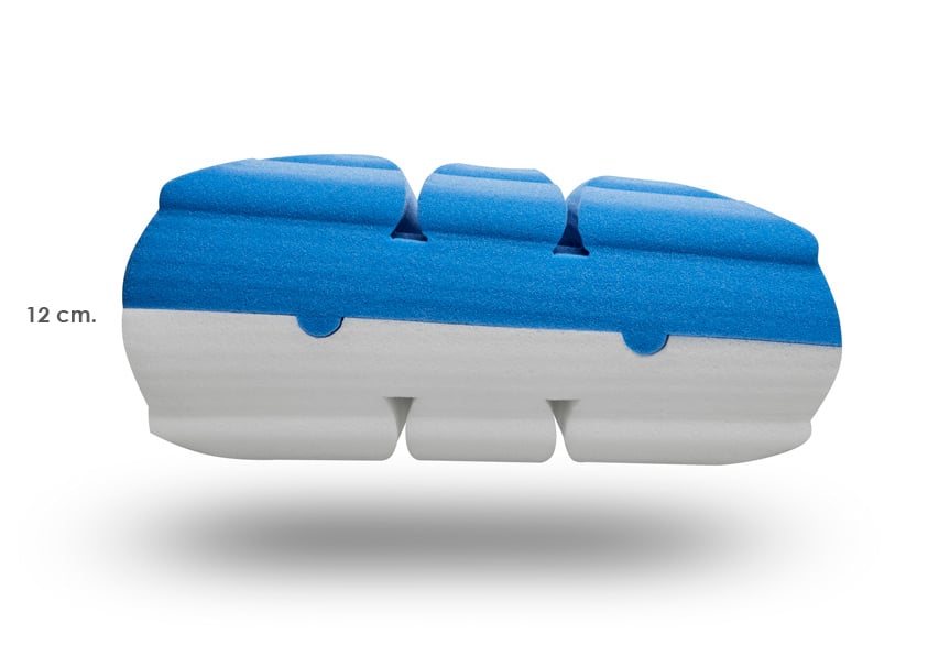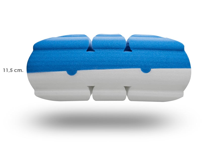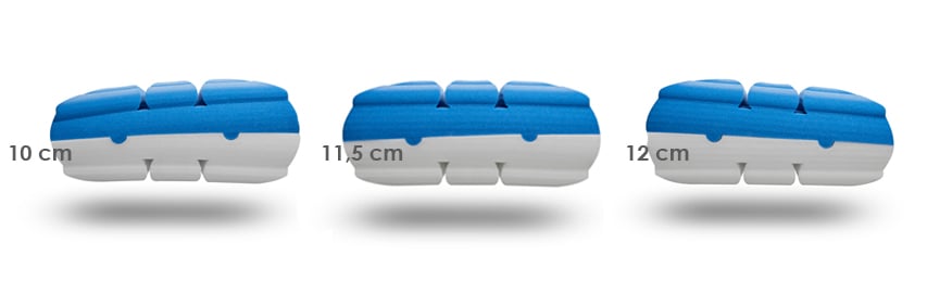 TEC MOON Flow S dispone de tres alturas combinando sus dos núcleos para que, sea cual sea tu cuerpo, tu espalda y cuello queden perfectamente alineados. Si combinas los núcleos para que quede igualada, tendrá un grosor de 11,5 cm. Si los combinas para que queden dos alturas diferentes, una será de 10 cm. y la otra de 12 cm.