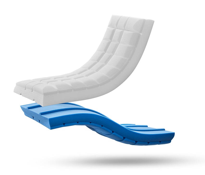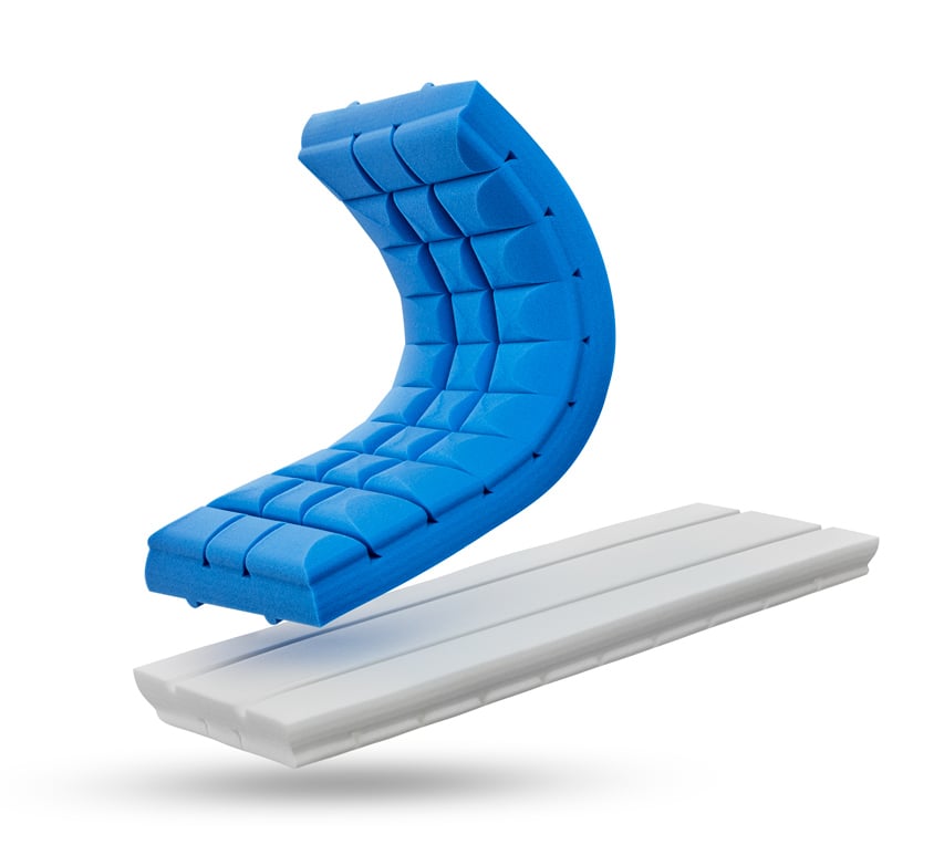 Núcleo tecnológico de dos espumas: la azul Viscocool, más firme y de 55Kg/m3 de densidad, es conductora de calor y ayuda a su evacuación para periodos cálidos. Mientras que la blanca Ikon, un poco más suave y de 50 Kg/m3 de densidad, lo conserva para que no se pierda en épocas de más frío.