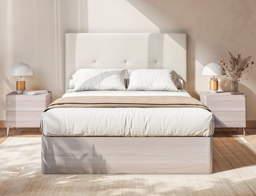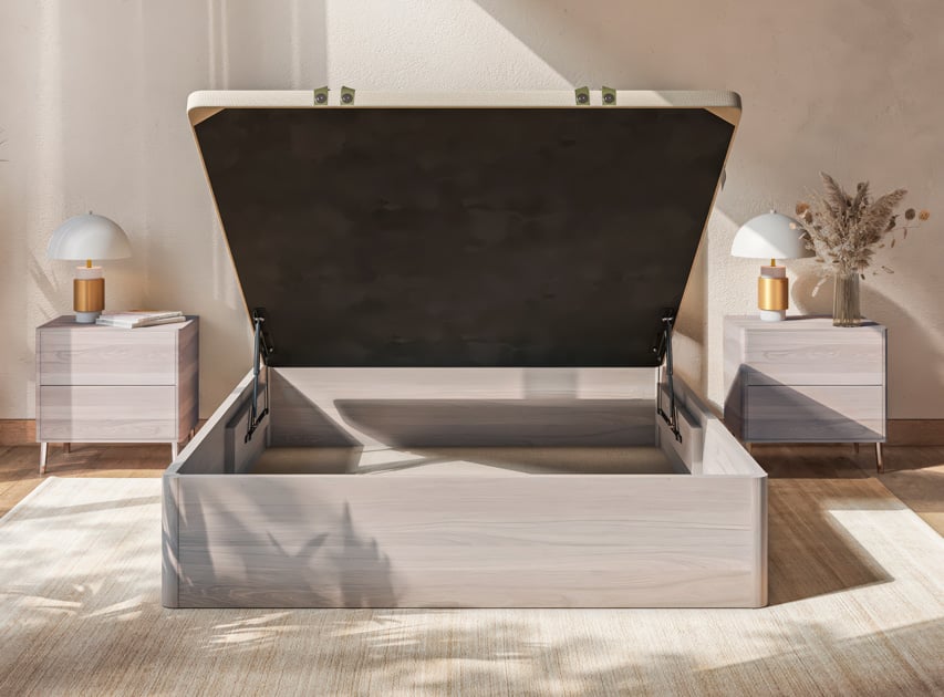 El canapé abatible Gran Store de Sonpura, tiene una capacidad máxima de almacenamiento, 31 cm. si eliges la tapa 3D o perímetro; y 24 cm. si eliges la tapa interior-embutida. Cuenta con una estructura con acabado de madera de 3 cm. de grosor. Su tapa de 6 cm. con estructura metálica y travesaños de refuerzo, ofrece estabilidad y durabilidad. Disponible en 5 acabados de madera.