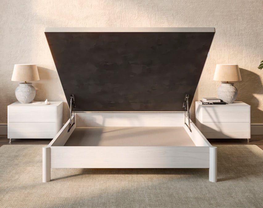 El canapé abatible Level de Sonpura presenta un diseño diferente, con patas esquineras de madera maciza sobre las que descansa la tapa voladiza elevada, con perímetro tapizado y parte central con tejido 3D antideslizante. Estructura con acabado de madera de 3 cm. La altura total es de 36 cm. y el hueco interior útil de 17 cm. Disponible en 5 acabados de madera.