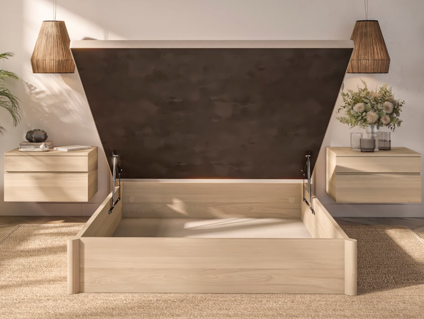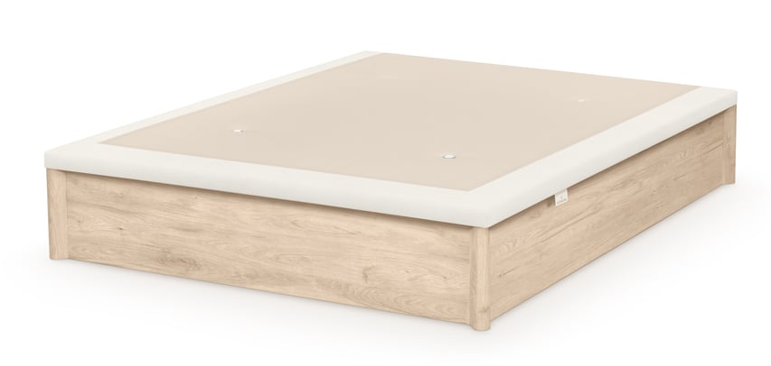 El canapé abatible Siluet de Sonpura presenta un diseño innovador y moderno. Estructura a suelo con acabado de madera de 3 cm. y patas esquineras sobre las que descansa la tapa voladiza elevada, con perímetro tapizado y parte central con tejido 3D antideslizante. La altura total es de 34 cm. y el hueco interior útil de 27 cm. Disponible en 5 acabados de madera.