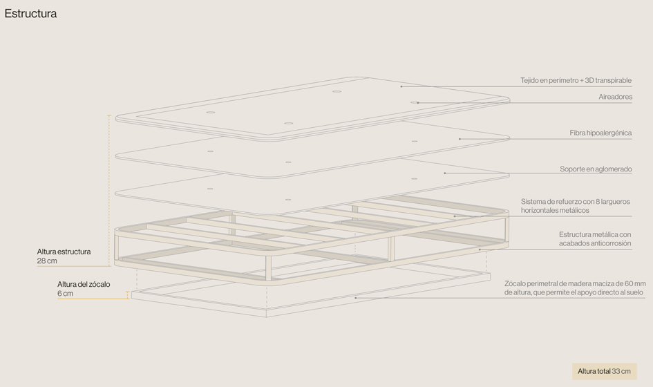 La base posee 8 travesaños metálicos horizontales de refuerzo, consiguiendo así una mayor durabilidad.