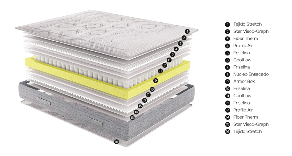 El colchón posee una capa de visco graph por ambas caras, con partículas de carbono, que ayuda a descargar la electridad estática que el cuerpo acumula durante el día por lo que podemos conseguir un sueño más reparador y placentero.