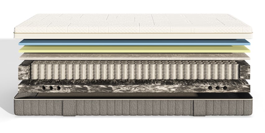Muelles ensacados encapsulados individualmente que proporcionan un nivel óptimo de tension y amortiguación, ajustándose a cualquier posición de descanso a la vez que dejan fluir el aire para dormir fresco y cómodo.