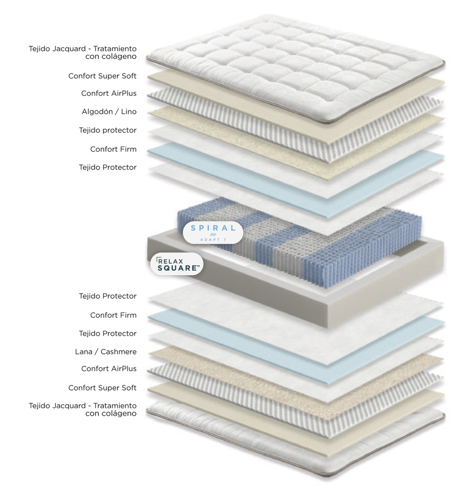 Los muelles ensacados Spiral Adapt 7 facilitan un descanso personalizado, otorgando la independencia de lechos ideal para un descanso totalmente reparador. Con 7 zonas de descanso diferenciadas que brindan a cada parte del cuerpo la firmeza que necesita, mejorando la adaptabilidad y confort, consiguiendo que tengas la mejor experiencia de descanso.