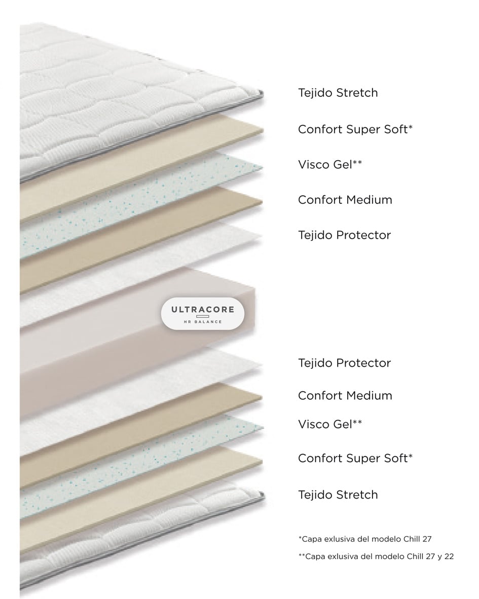El colchón Chill de Relax es una opción versátil y resistente. Cuenta con núcleo HR Ultracore, que garantiza un soporte estable y duradero. Disponible en 4 alturas: 15, 18, 21 y 27 cm.  para que elijas la que se ajuste a tus necesidades. Acolchado con Visco Gel (en grosor 27 y 21), con tecnología termoreguladora y Confort Medium, confortable y resistente.