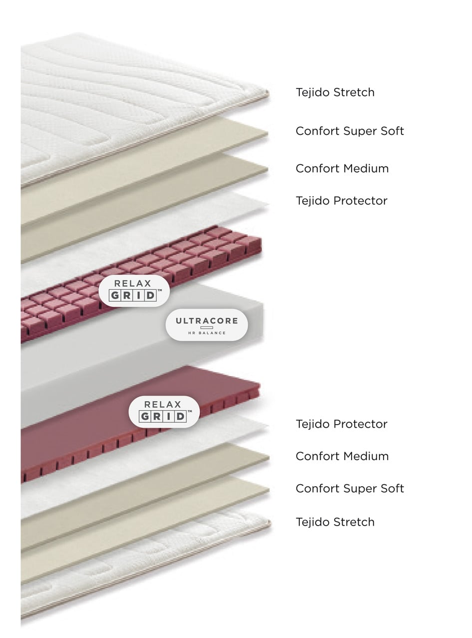 El colchón Comfortgrid de Relax cuenta con un núcleo de HR Ultracore, firme y estable, combinado con una capa de tecnología Relax Grid, con 250 microzonas de apoyo que se adaptan al cuerpo a medida que cambias de posición. Acolchado por ambas caras con Confort Medium y SuperSoft, espumaciones de alta calidad que dan un confort excepcional.