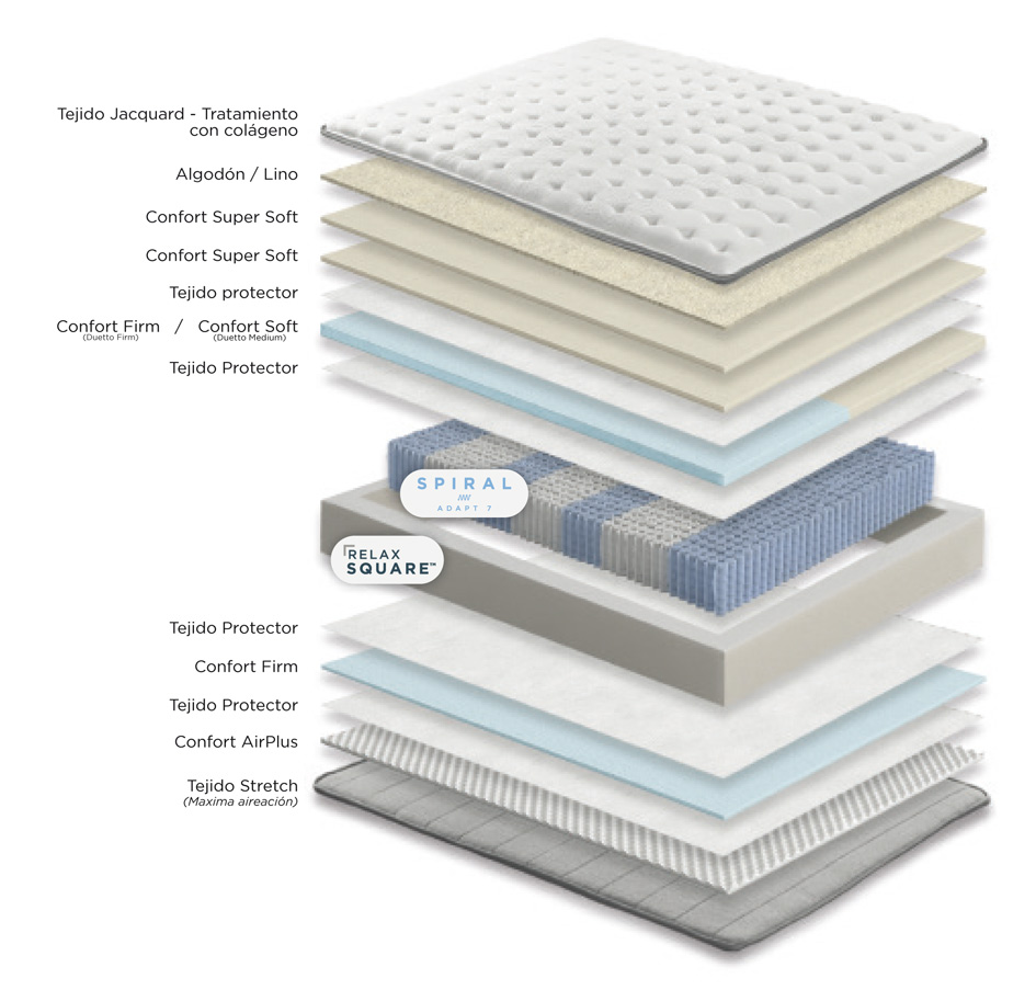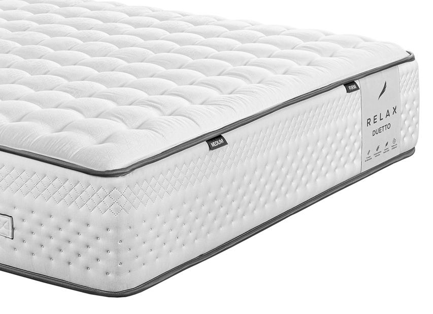 El colchón Duetto de Relax cuenta con un núcleo de muelles ensacados Spiral Adapt combinados en 7 zonas diferentes de descanso. Según la firmeza deseada, puedes elegir Duetto Medium (firmeza 4 medio-dura) o Duetto Firm (firmeza 5 dura); o bien, Duetto Dual, con una firmeza en cada lecho (a partir de de 135 cm. de ancho). Acolchado con espumación Confort Supersoft y Firm y fibras naturales: algodón y lino