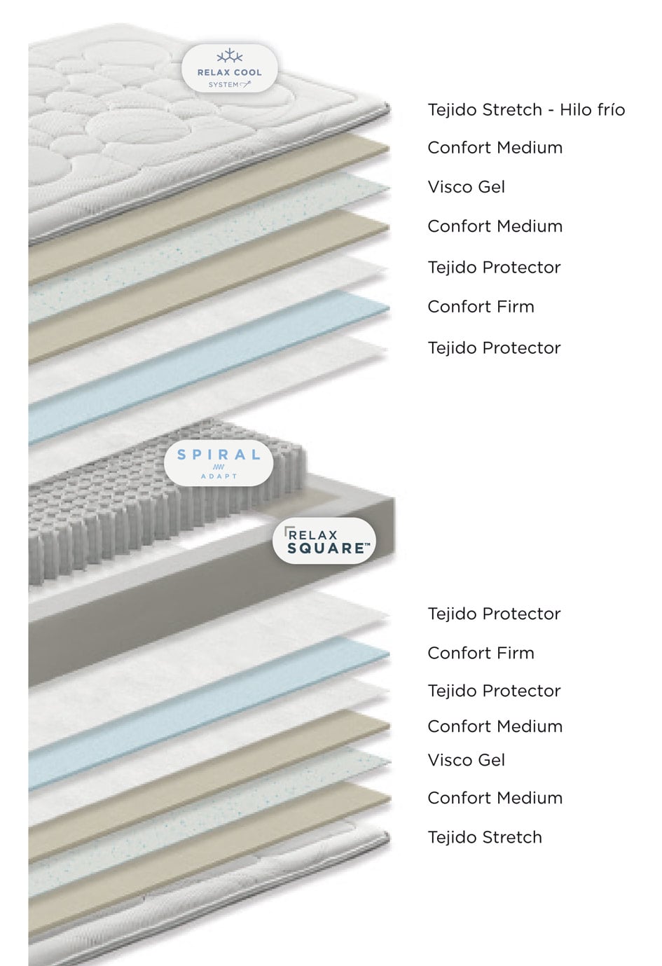 El nuevo colchón Thermobalance de Relax cuenta con un núcleo de muelles ensacados Spiral Adapt, que le aporta una magnífica independencia de lechos. Acolchado en ambas caras con Viscogel, adaptable y termoregulador, y Confort Medium y Firm, estable y confortable. Tapizado en la cara superior con tejido Strech con hilo frío, sistema Relax Cool..