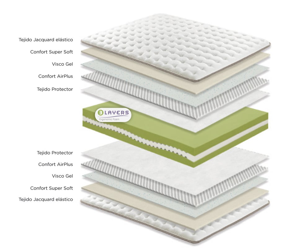 El colchón Vanguard de Relax cuenta con un innovador núcleo 3Layers, con 3 capas de espuma de gran calidad que se adaptan a la morfología de tu cuerpo, gracias a sus 30 puntos de apoyo. Acolchado por ambas caras con Viscogel, adaptable y termoregulador; y Confort SuperSoft y Airplus, espumaciones de alta calidad que dan una estabilidad y confort excepcional.
