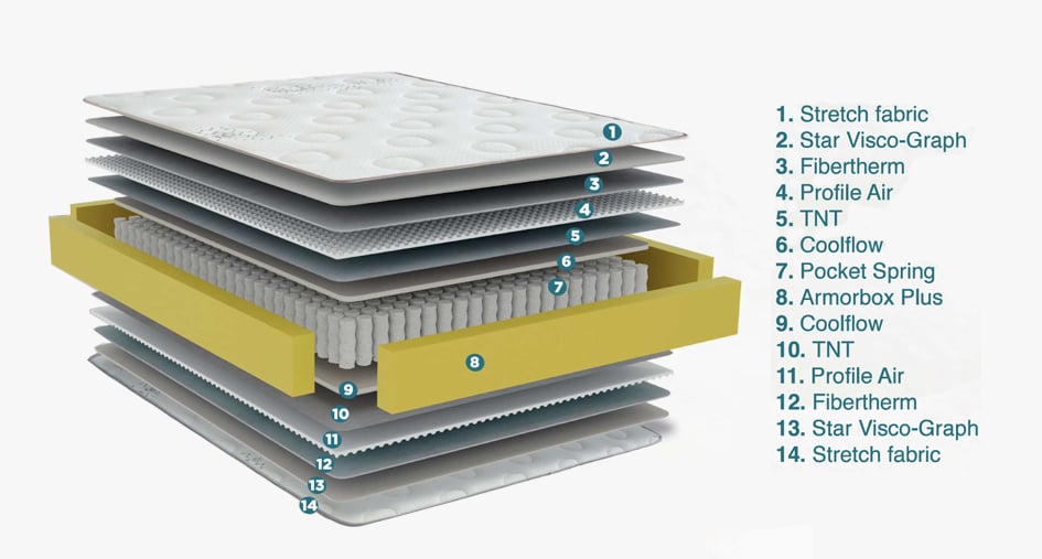 Sin contar el núcleo ni las tapicerías de la cara A y B, este colchón, para su fabricación, cuenta con 10 capas de amortiguación. El número de capas está relacionado con la calidad del colchón.