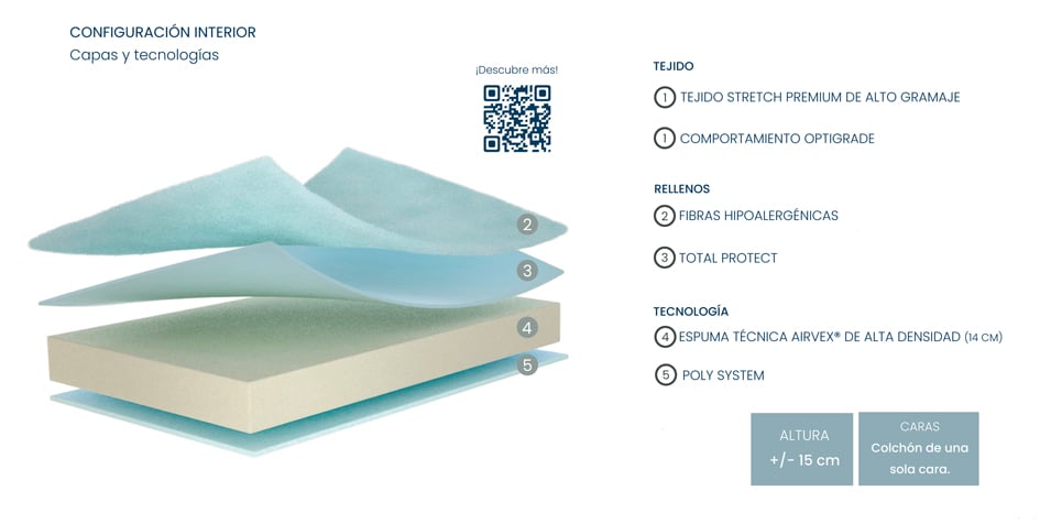 La tapicería Stretch Premium de alto gramaje, junto con las fibras hipoalergénicas y la estructura de célula abierta del Airvex®, favorecen una óptima circulación del aire en todo el colchón.