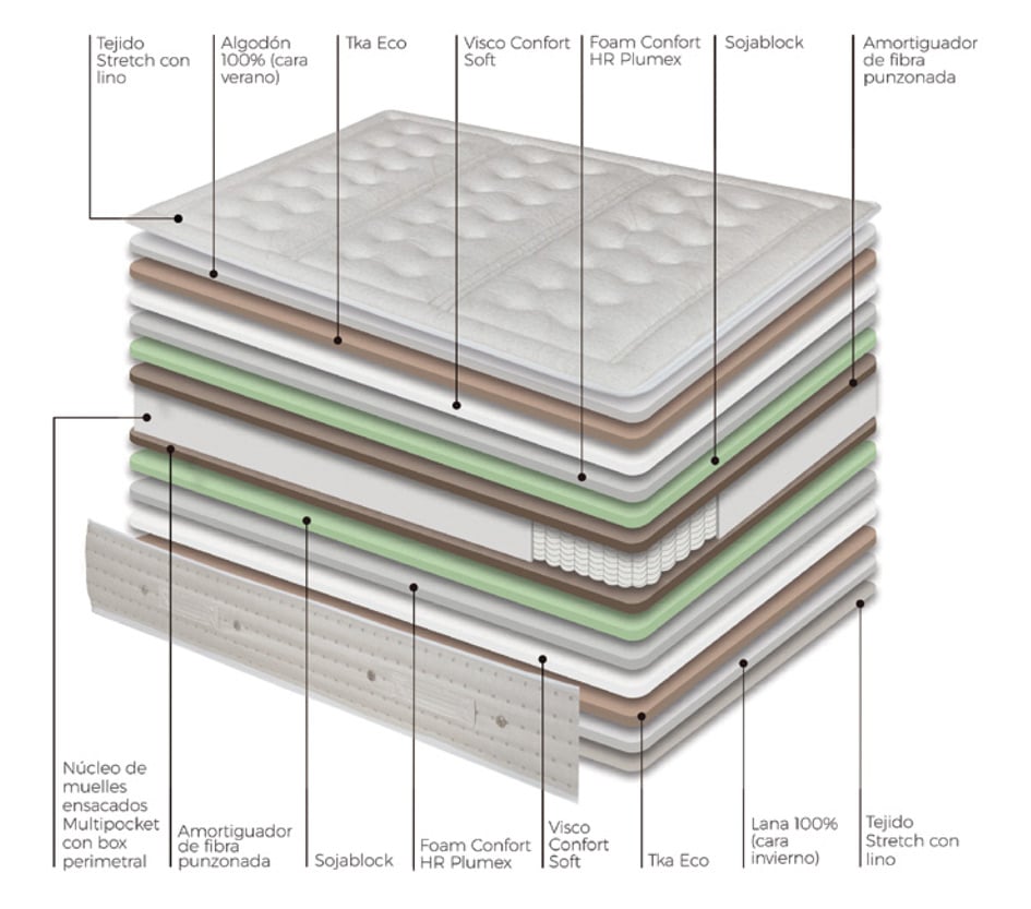 Como observamos, hay algunas capas de acolchado, que sí están presentes en ambas caras. Estas son: la espumación Sojablock (una soja transpirable y muy adaptable, que recupera muy rápidamente su posición original), viscoelástica Visco Confort Soft (muy suave y con memoria de lento retorno, que se amolda al calor que despide el cuerpo) y espumación HR Plumex Soft (que aporta confortabilidad).