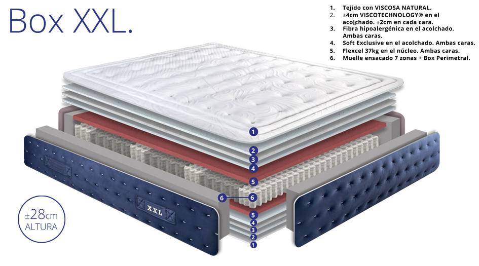 Nuestro modelo exclusivo Box XXL es un gran colchón. Destaca su núcleo de muelles ensacados que aporta hasta siete zonas de descanso diferenciadas. Esto permite que cada zona del cuerpo obtenga el soporte necesario en función del peso. Su firmeza es medio dura, de 4 sobre 6.