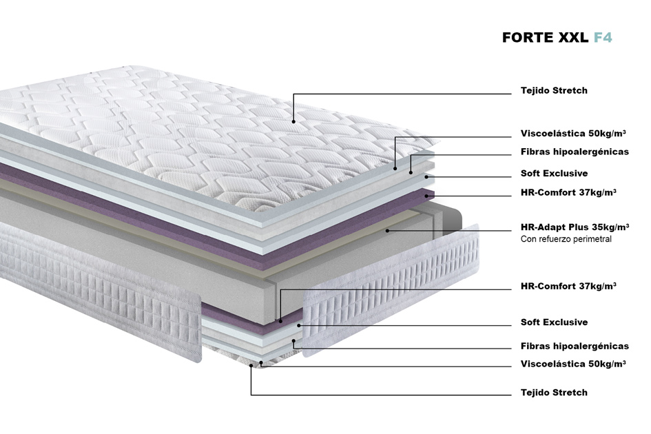 En ambas caras del colchón Forte XXL medio duro encontramos los mismos componentes. Sus acolchados son de fibra hipoalergénica, espumación Soft Exclusive extrasuave y viscoelástica premium. El tapizado es en tejido Strech con tratamiento antiviral que elimina hasta en un 99% la carga viral.
