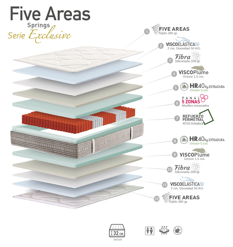 El tapizado es en tejido Strech de fibras especiales Five Areas para aportar frescor. En total el grosor de este colchón es de 32 cm. Es perfecto para deportistas, para parejas y está tratado contra los ácaros. Además, reduce las dolencias lumbares.