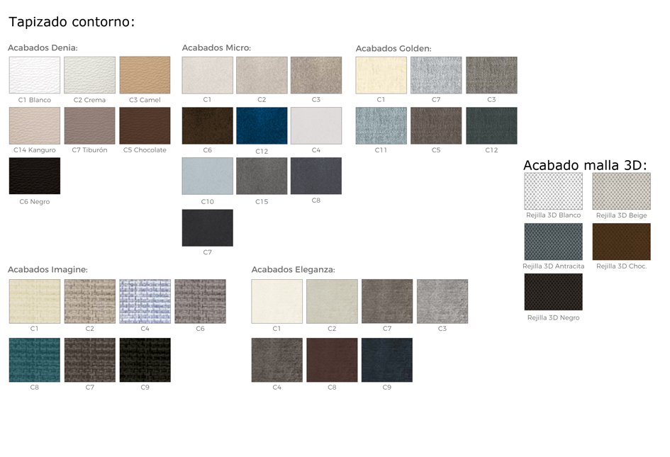 En la siguiente imagen te mostramos todas las opciones de colores de tela y polipiel que puedes elegir. Marca la que prefieras en el desplegable que tienes a la derecha en la ficha de producto.