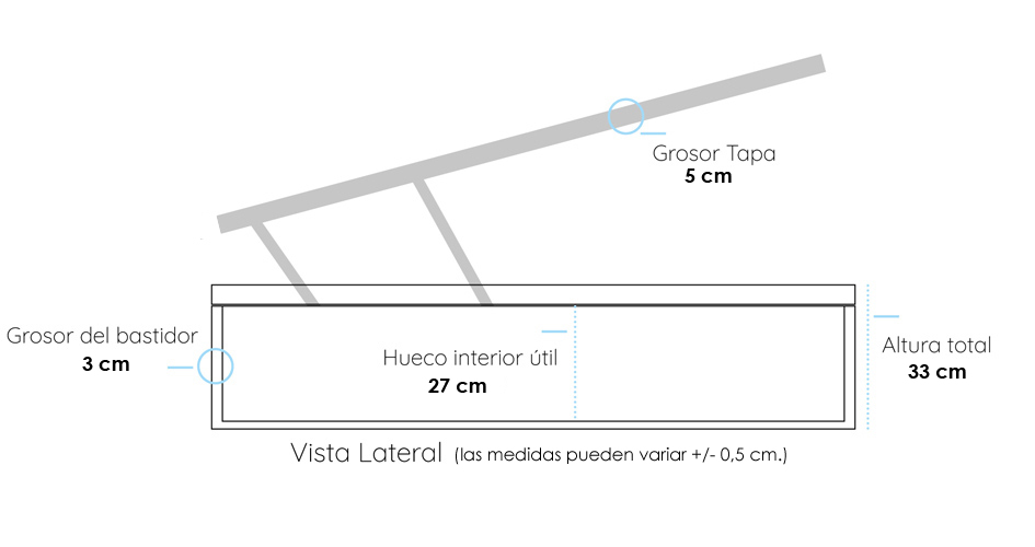 El extra de almacenamiento que te aporta un canapé abatible es una de las características más valoradas en este tipo de bases. En este modelo de Colchones.es la capacidad o fondo útil del arcón interior es de 27 cm.