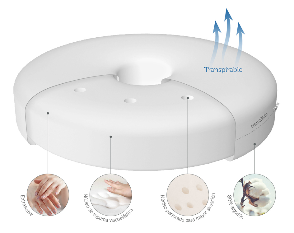 Su núcleo de viscoelástica permite una sentada suave y sin presiones. Al ser un material que ofrece una adaptabilidad progresiva, permite estar sentado cómodamente sin sufrir las molestias provocadas por las hemorroides o las lesiones en el coxis o parte baja de la espalda.