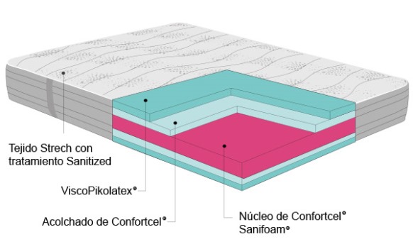colchon con nucleo confortcel, espumacion especial de Pikolín, acabado en viscopikolatex, para evitar sudoracion excesiva, necesita ventilación por lo que es recomendable el uso sobre somier de laminas.