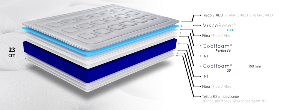 - Viscoelástica Reset Gel que permite una adaptabilidad perfecta para que la columna se mantenga alineada durante las horas de sueño. Además, las partículas de gel ayudan a disipar el calor, aportando frescor.