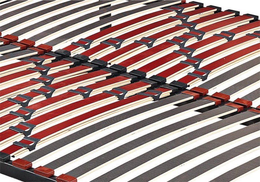 Unidas a la estructura dispone de 20 láminas de madera de 48 mm de ancho de gran durabilidad. En la zona central incorpora refuerzo lumbar con 6 láminas dobles, 12 en la medida de 135 cm en adelante. Con ello se consigue reforzar la zona lumbar. Acompañando a las láminas centrales encontramos reguladores de firmeza para que cada durmiente pueda elegir el grado de firmeza y adaptabilidad que necesite para su descanso.