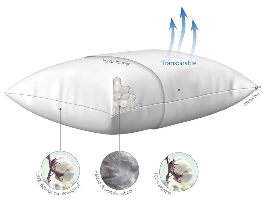 Para proteger el núcleo de plumón, Pikolin Home recubre su almohada con una doble funda. La interior está confeccionada con 100% algodón Percal y la exterior con 100% algodón. Este material aporta una gran transpirabilidad que favorece la ventilación y evita así que la humedad se condense en el interior.