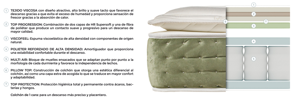 Después encontramos una capa de viscoelástica Visco Feel compuesta por materiales de origen natural que aportan gran acogida al descanso, reduciendo los puntos de presión y permitiendo una posición saludable para la espalda durante las horas de sueño.