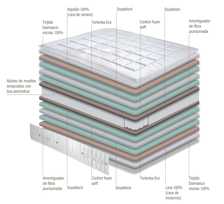A estos componentes se une en la cara verano: fibra natural de algodón y en la cara invierno: fibra natural de lana de oveja. El tapizado de ambas caras es de tejido viscosa 100%, perfecta para climas calurosos y húmedos.