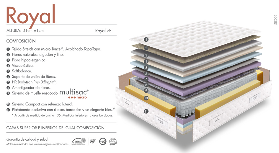 El tapizado del colchón Royal es tejido Viscosa, fresco y suave Es un colchón muy transpirable. Además, Sonpura incluye tratamientos higiénicos a este colchón. Cuenta con un tratamiento específico contra los ácaros. Está certificado Hyg-Cen (libre de citotoxicidades y es apto incluso para su uso hospitalario y sanitario), Öeko-Tex (los tejidos del colchón están exentos de sustancias nocivas) y Certipur (respeta la salud y el medio ambiente).