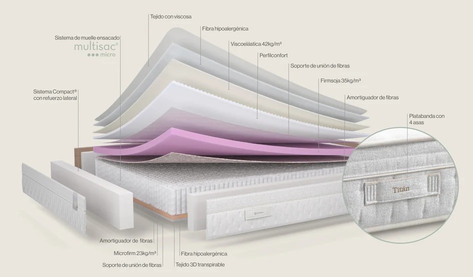 La firma Sonpura dispone de su propia tecnología patentada de muelles ensacados. Es la tecnología Multisac, dentro de ella existen tres gamas diferenciadas. En el caso del colchón Titán es la gama más alta, la que incluye un mayor número de resortes.