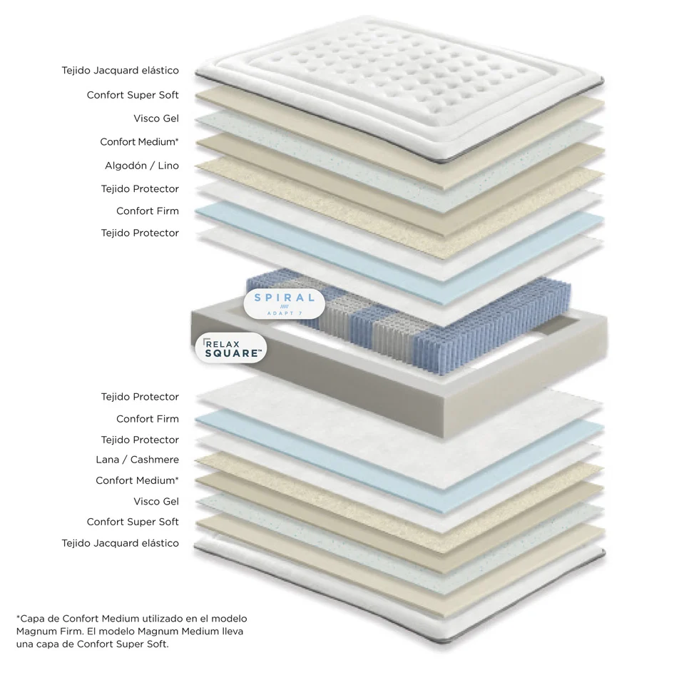 Entre las grandes diferencias del colchón Magnum Relax con Titán Sonpura están las capas y caras de acolchado. Las puedes ver a continuación.