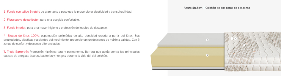 Estos dos colchones de látex se tratan contra los ácaros, las bacterias, los hongos. Se incluye el tratamiento Triple Barrera de Pikolin para garantizar un descanso higiénico y saludable.