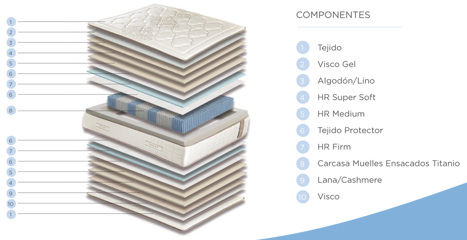 La cara verano incluye una capa de viscoelástica con gel que aporta adaptabilidad ergonómica y disipa el calor, fibras de lino más frescas y varias capas de espumación HR (super soft, medium y firm) aportan el sustento adecuado en función del peso.