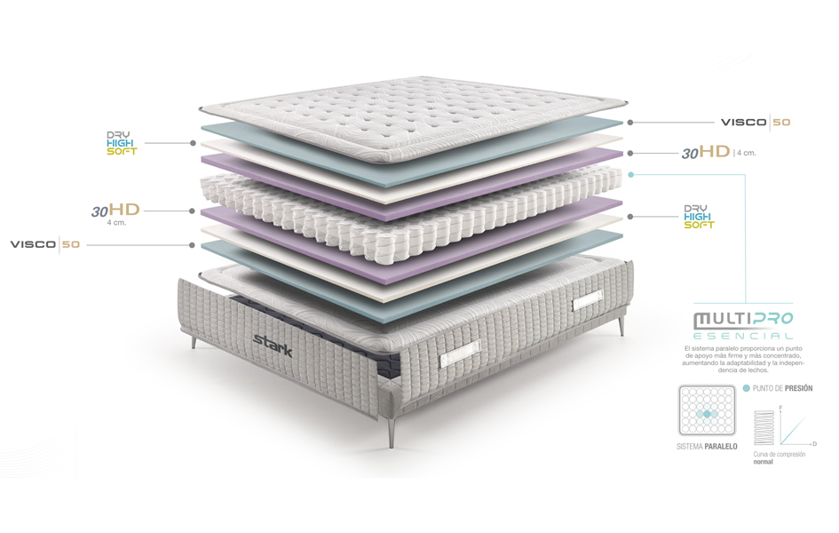 La firmeza extra alta se consigue con el sistema de muelles ensacados Multipro. Son muelles de 18 cm de altura que se embolsan en sacos de 12,5 cm de altura. Esto hace que el muelle se flexione y aporte más firmeza.