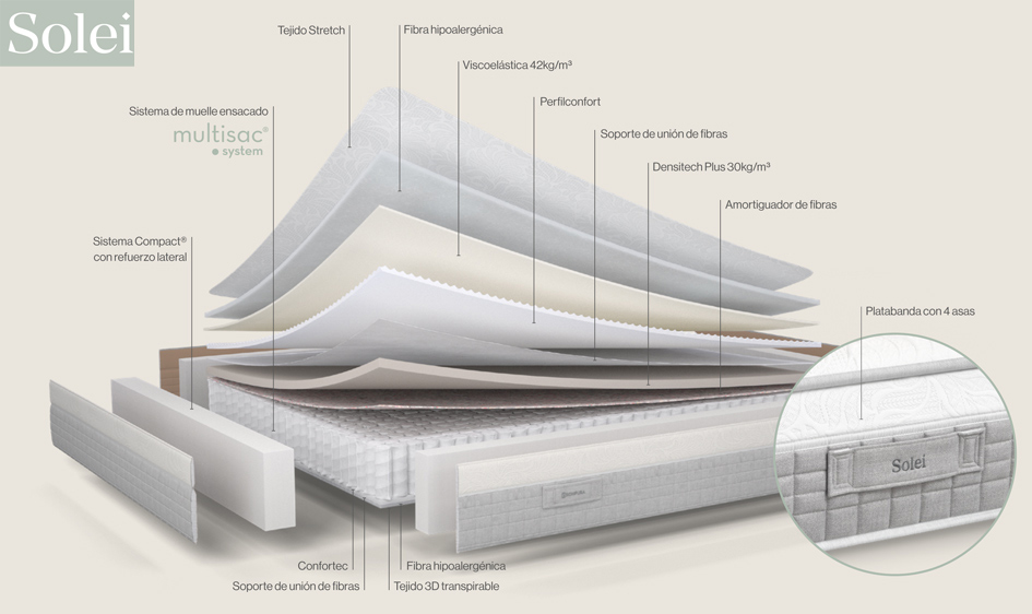 La cara verano, la más fresca es de acolchado de viscoelástica y espumaciones Soft Foam y Foam. Y el tapizado es con tejido CoolFresh, para aportar frescor a los calurosos y las cálidas noches de verano.