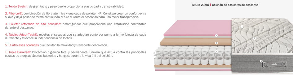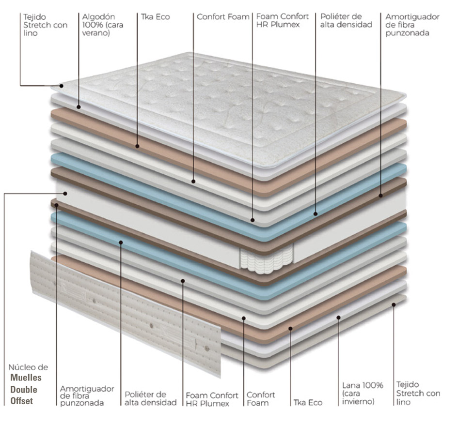 El acolchado más fresco se compone de una capa de fibras de algodón 100% natural, espumación HR Plumex Soft y espumación Confort Foam. La cara de invierno cambia el algodón por la lana de oveja 100%. El resto de capas son iguales.