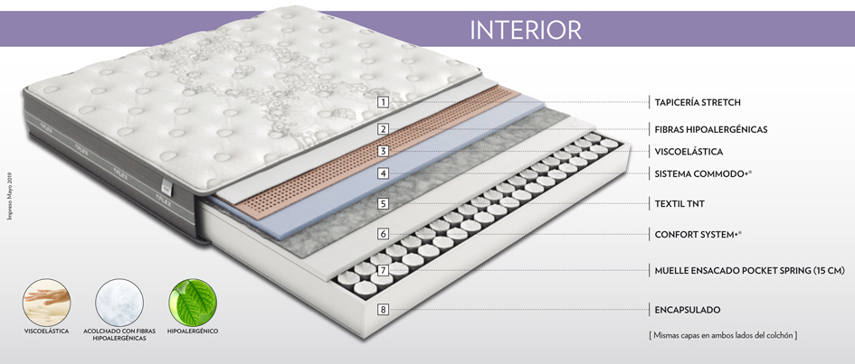 Su núcleo de muelles ensacados con la tecnología Spring Pocket (resortes de 17 cm de altura y 6 cm de diámetro), además, de favorecer la ventilación interior, aporta hasta 5 zonas de confort diferenciadas. De modo que elimina la presión en las zonas de mayor peso corporal: hombros, cadera y rodillas.