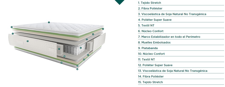 El colchón Terxy Navia dispone en ambas caras de: viscoelástica con soja natural no transgénica, fibras naturales y espumación super suave. Es un acolchado de gran adaptabilidad y frescor. El grosor total del colchón es de 30,5 cm.