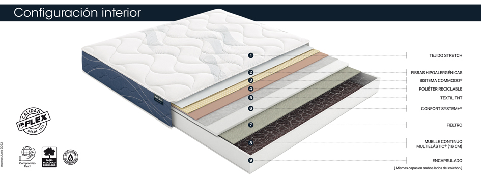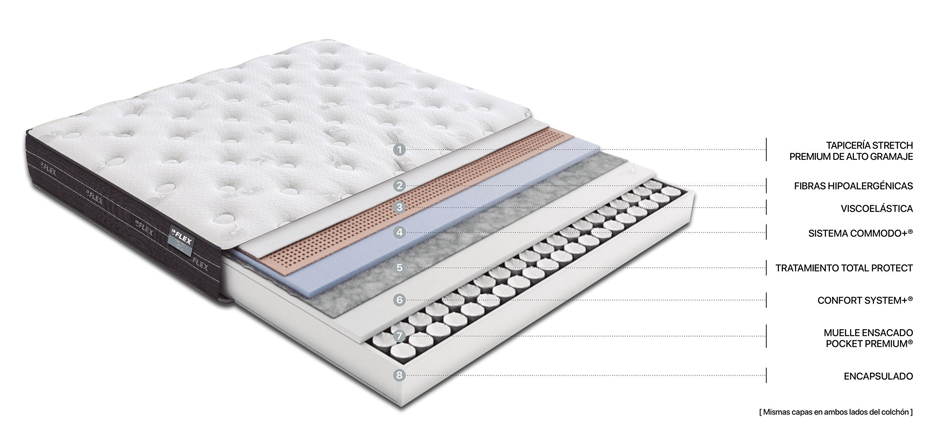 En las capas de acolchado del Habana Flex encontramos otro tipo de espumaciones. Es un acolchado Confort System+ que ofrece una adaptabilidad ergonómica, aportando acogida y suavidad al descanso. Cuenta con la tecnología Commodo+ que reduce los puntos de presión. El tapizado es en tejido Strech que destaca por su capacidad termorreguladora, su suavidad y su elasticidad. El grosor de este modelo es de 29 cm.