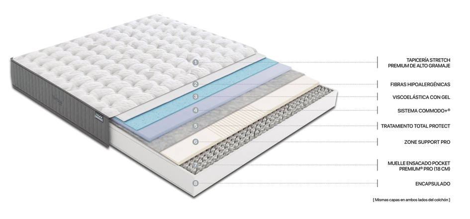Por su parte, el Nimbus Visco es un colchón mucho más grueso. En total la altura es de 33 cm. Los acolchados, en ambas caras, cuentan con diversas capas: viscoelástica con gel (disipa el calor), espumación Confort System y sistema Commodo+. Estos acolchados aportan adaptabilidad y eliminan los puntos de presión. El tapizado es igual, tejido Strech.