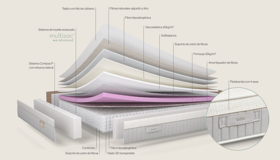Los acolchados también son diferentes. El Indra está acolchado en la cara superior con una capa de viscoelástica, una capa deFirmsoja y una capa de fibras naturales. Además, dispone del sistema Perfil Confort. Con ello ofrece una adaptabilidad perfecta y aporta efecto masaje al descanso. El grosor total es de 31 cm.