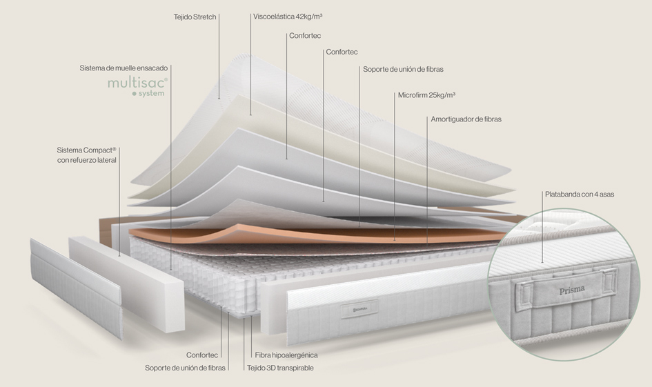Sonpura es el fabricante especializado en muelles ensacados. Cuenta con su propia tecnología patentada, el sistema Multisac. Dentro de esta tecnología hay tres sistemas diferenciados. En el caso del Prisma, el núcleo es de muelles ensacados Multisac System. Este sistema es el más básico de los tres. Incluye un total de 500 muelles independientes en la medida de 150×190 cm. En cuanto a la firmeza del Prisma se cataloga como medio dura, de 4 sobre 6.