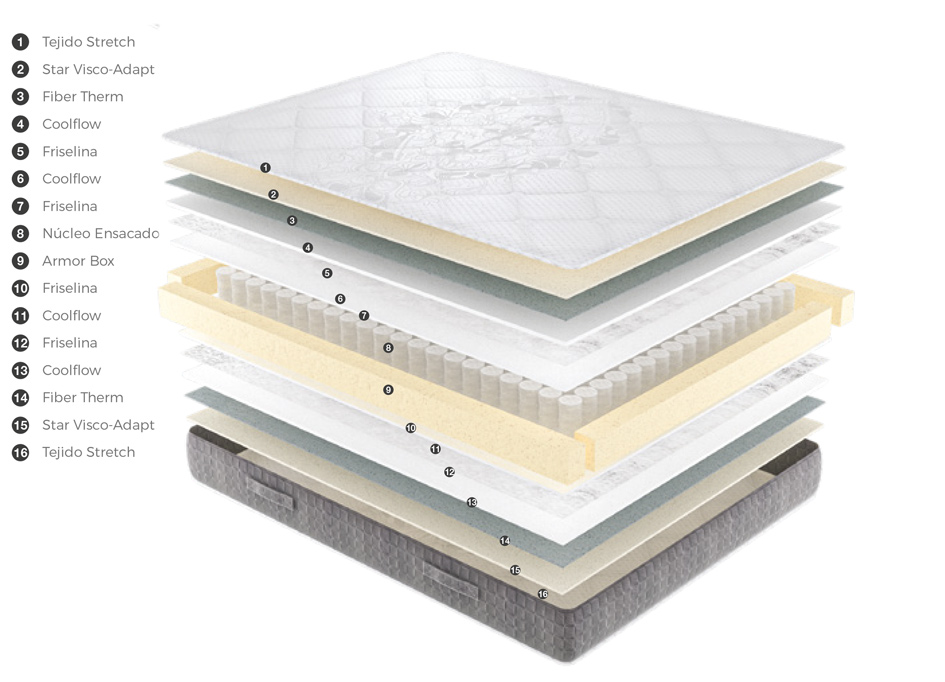 Al contar entre sus capas de acolchado con viscoelástica, este material con alto efecto memoria, se adapta al cuerpo, sin producir presión, relajando así los músculos y aportando un gran confort al descanso.
