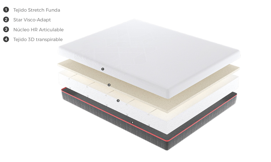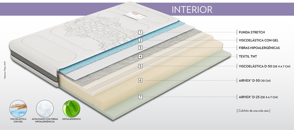 El acolchado del colchón Space Visco cuenta con una capa de 3 cm de viscoelástica con gel, que disipa el calor, aportando mayor frescor al descanso. Solo está acolchado por la cara superior. Además, incluye una capa de fibras hipoalergénicas que evita alergias. Dispone de una funda exterior que se puede extraer para lavar en seco.
