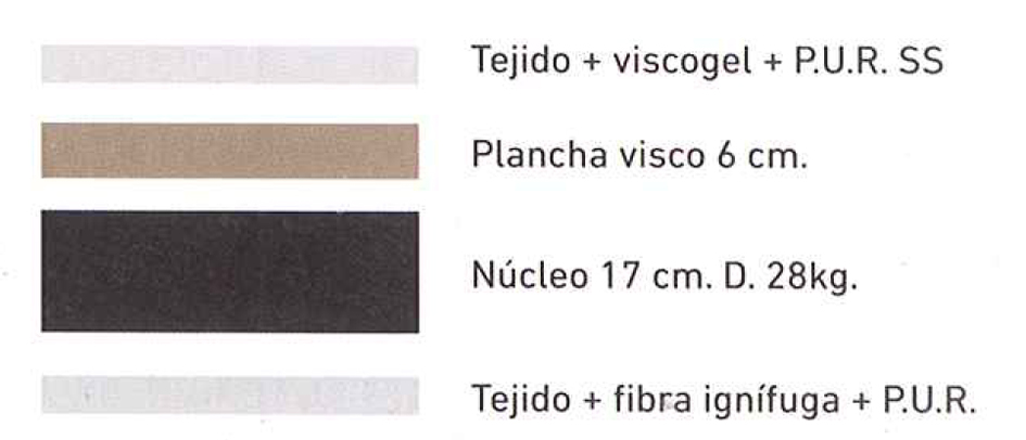 El colchón Visco 8 cm de Colchones.es, al igual que el Royal, solo está acolchado en la cara superior. Se añade un bloque de viscoelástica de 6 cm de grosor pegado al núcleo y después una capa de 2 cm de viscoelástica con gel que ayuda a disipar el calor. El grosor total es de 27 cm. El tapizado es en tejido suave y en la cara inferior cuenta con fibras ignífugas autoextinguibles, en caso de fuego.