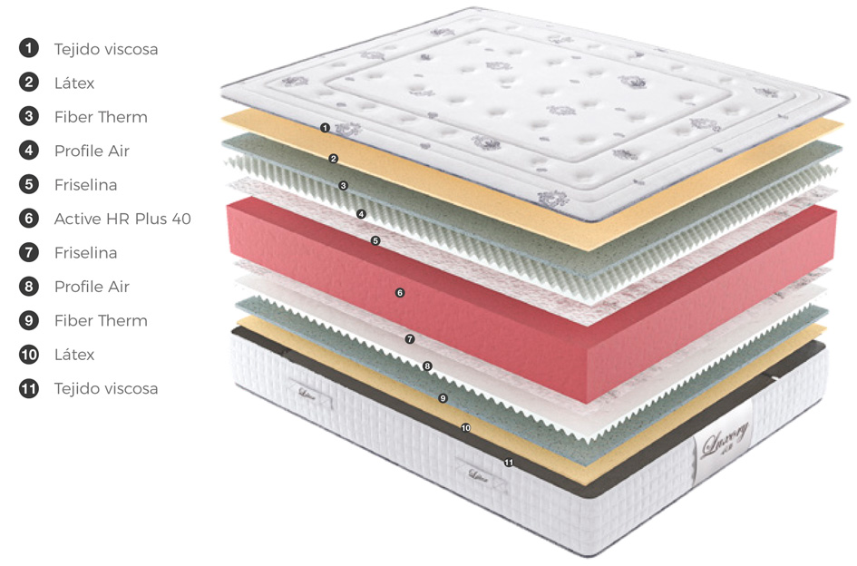El modelo Royal de Loverty está acolchado solo en la cara superior. Su composición es: 2,5 cm de espumación Estabilizer Foam, 7 cm de Viscoelástica atérmica y 1,5 cm de espumación Confort Gel Fresh que disipa el calor. El tapizado es una funda de tejido Tencel muy suave. La zona inferior está tapizada con tejido antideslizante, para que el colchón no se desplace con los movimientos. Cuenta con otra funda interior para mayor protección y los laterales cuentan con tejido transpirable. La altura total del colchón es de 32 cm.