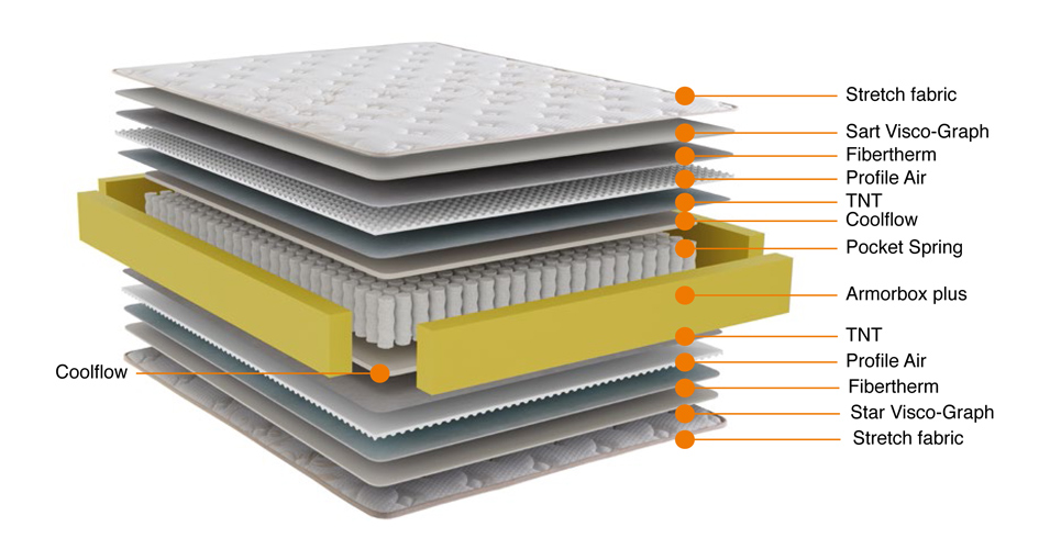 El Box XXL está acolchado con los siguientes materiales en cada cara: 2 cm de viscoelástica Visco Technology (incluye partículas de grafeno, carbono y gel que disipan el calor y aportan gran adaptabilidad), espumación Soft Exclusive y fibras hipoalergénicas que aportan frescor. El tapizado es en tejido Strech de viscosa natural que aporta suavidad, elasticidad y aireabilidad al colchón. El grosor total es de 28 cm.
